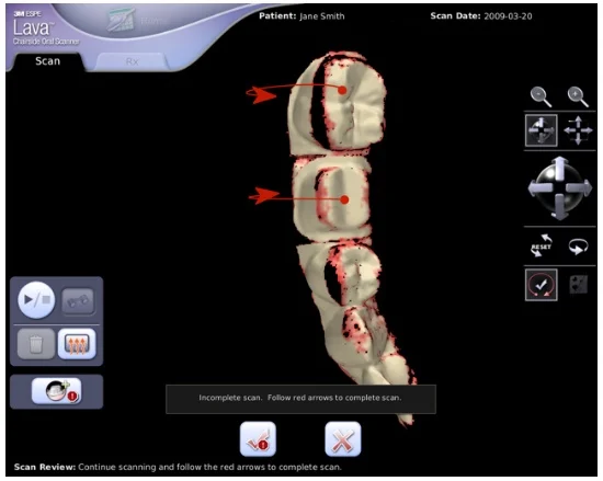 Version 2.0 of the Lava C.O.S. has a new tool to help you evaluate your scan quality. The Completion Arrows feature lets you know right away—before the case is sent to the lab—whether you have followed the scan path with enough accuracy to proceed. If the scan path needs correction, this tool shows you where to fix it.