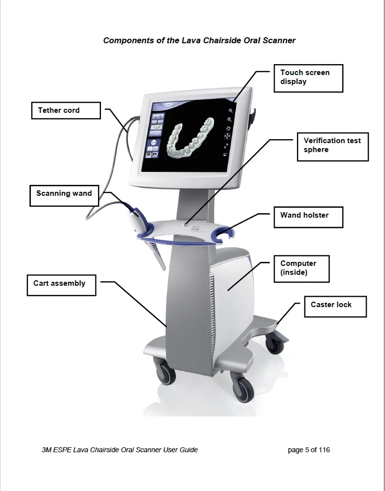 The 3M ESPE Lava Chairside Oral Scanner captures high-accuracy digital scans of teeth. Data from these scans are used in manufacturing oral prostheses such as crowns, inlays, and onlays.